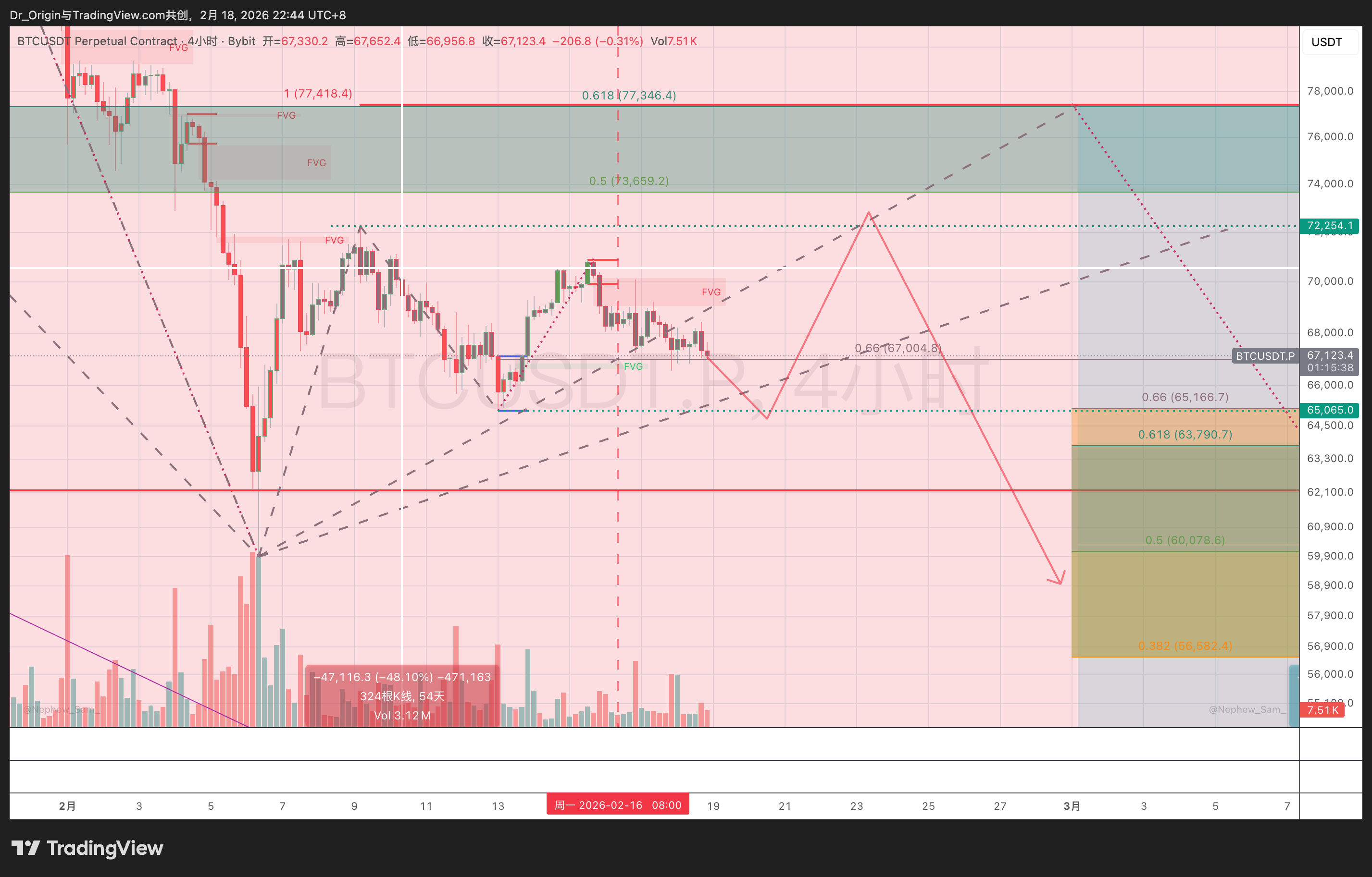 在上期报告(《春节特刊与Plan B交易计划》)中我们强调了主力的抢跑逻辑。原本市场普遍预期的完美做空位置在0.618回撤位(77,418美元附近),但由于市场的一致性预期过于强烈,以及熊市反弹的无力,大量聪明钱提前在0.382-0.5回撤位(67,000 - 73,600美元区间)行动,价格在触及72,254美元的局部高点后,便遭遇了持续的抛压,形成一个下降通道。
