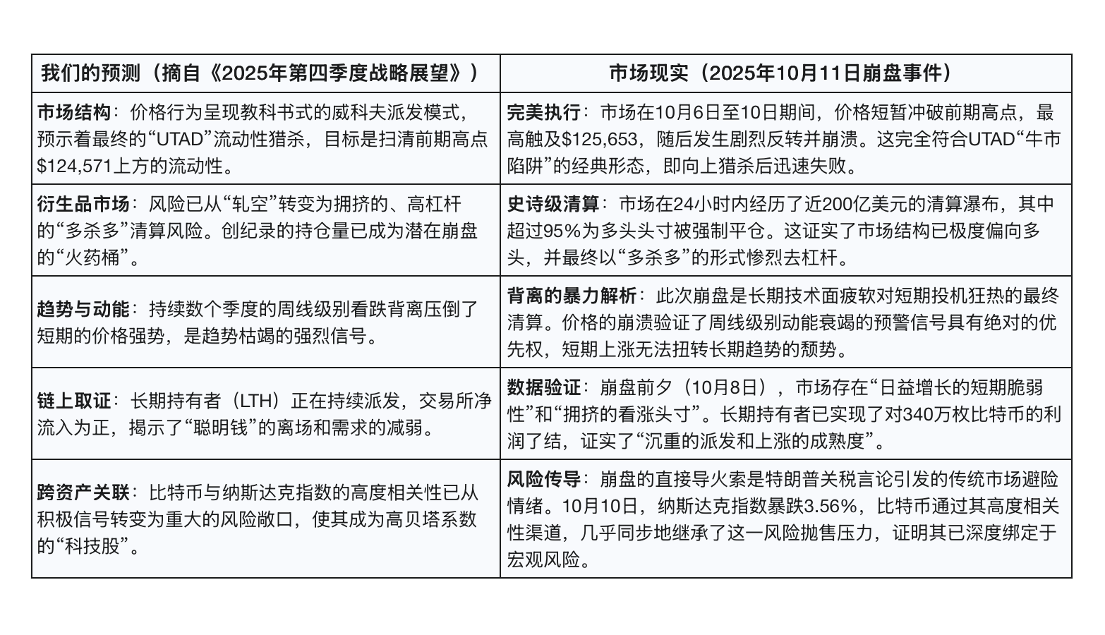 首先,我们来系统性地回顾《2025年第四季度战略展望》报告中的核心预测,并将其与10月11日发生的市场现实进行逐一比对。下表清晰地展示了我们的理论模型如何转化为精准的市场预言。