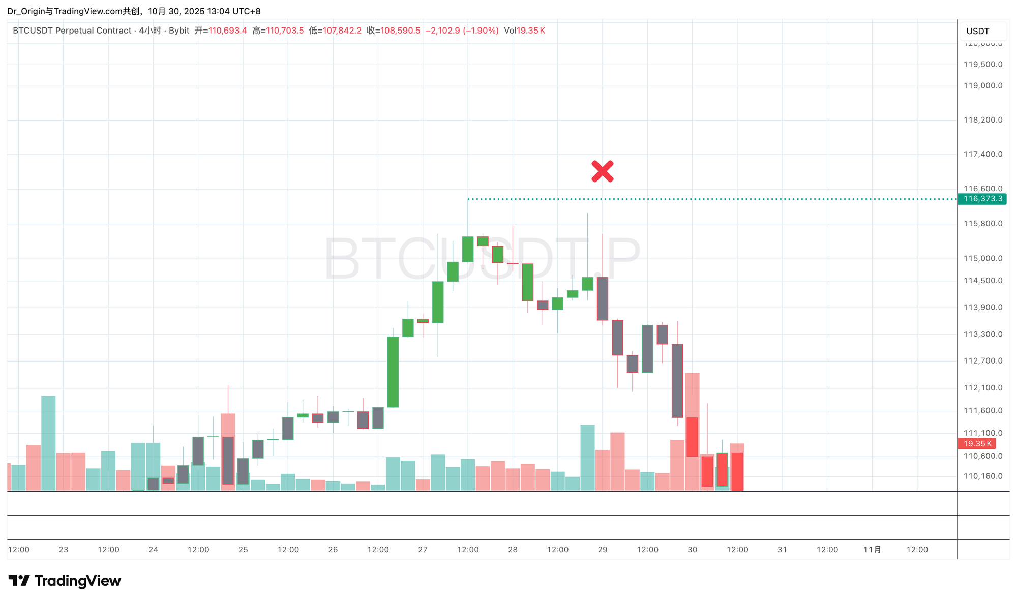 自10月2日以来,Origin Research的分析框架在市场中获得了无可辩驳的验证,我们的预测准确率达到了100%的完美记录。尤其值得注意的是,在题为《验证:116,000到了,我们该如何做空》的报告中,我们精确地识别出了$116,000美元的关键做空点位,市场随后的走势完全印证了这一判断。这一成功,建立在先前报告对市场结构的深刻洞察之上,即市场正在运行一个精心设计的“流动性农场”,其目的在于培育并最终收割空头,为大型参与者的派发服务。