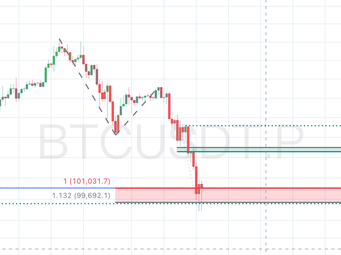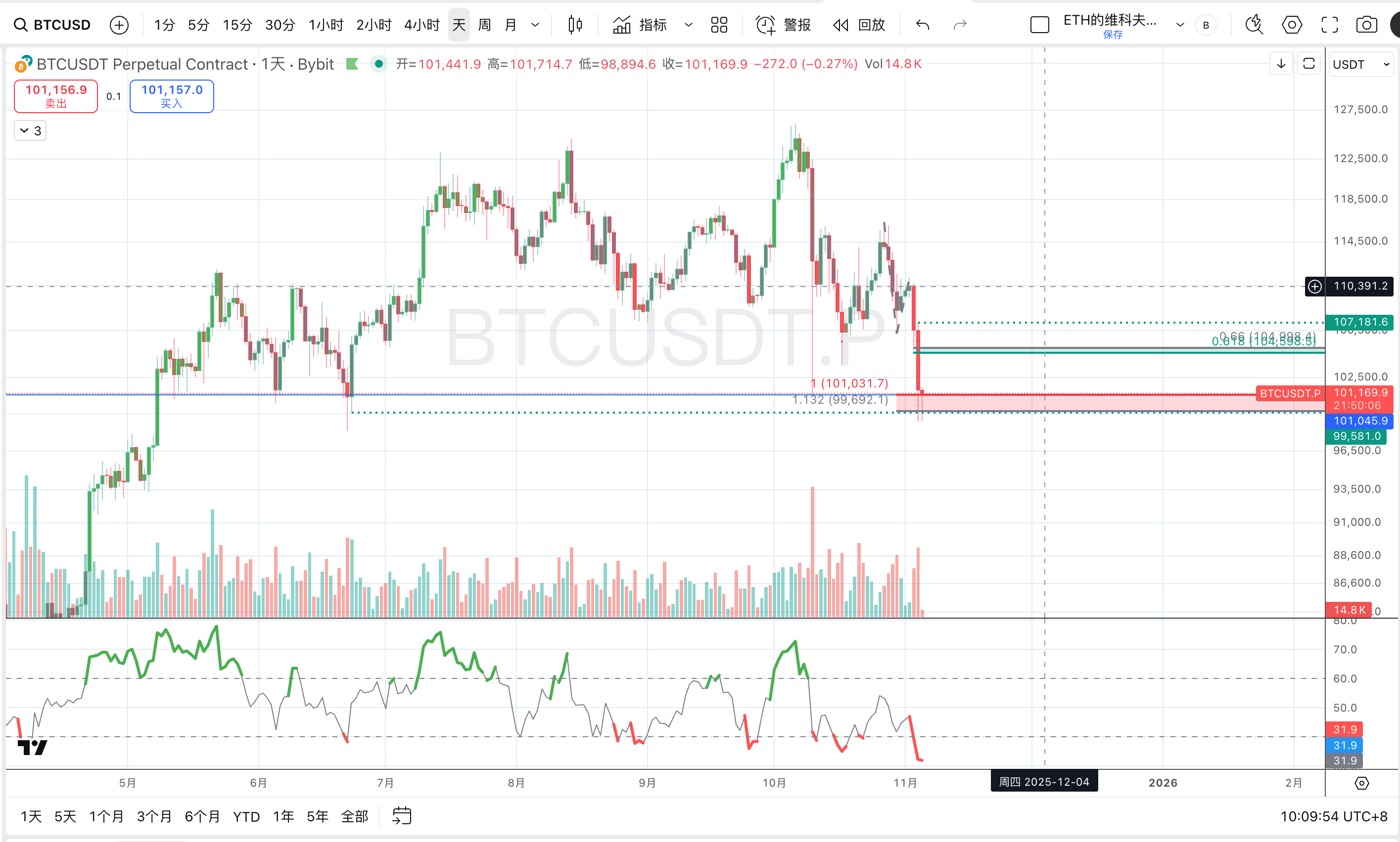 斐波那契拓展 : 如图所示,价格完美且精准地触达了1.132斐波那契趋势拓展位($99,692.1)。这一水平是通过对近期高点(约$116,000)、反弹低点(约$107,000)和次高点(约$111,000)的复杂测量得出的。这种“非常规”斐波那契水平的精准触达,通常标志着算法交易和机构量化模型的高度关注点,是精确反转或盘整的强大触发器。